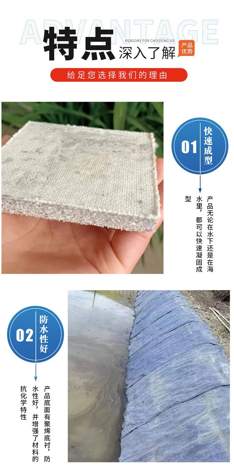 3.防水工程:水泥毯可以用于水庫、渠道等防水工程,通過鋪設(shè)水泥毯和土工膜來加固堤壩和防止?jié)B漏。水泥毯的快速固化特性使其能夠迅速形成堅固層,提高工程的可靠性和耐久性。