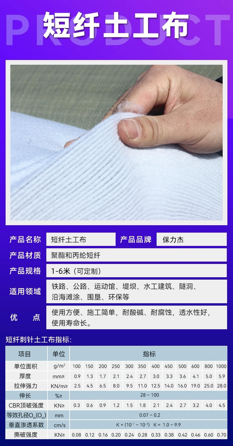 短絲土工布是以高強(qiáng)丙綸短纖維為主要原料,經(jīng)開松、梳理、雜亂、鋪網(wǎng)針刺以及噴灑拒水劑等工藝生產(chǎn)而成。