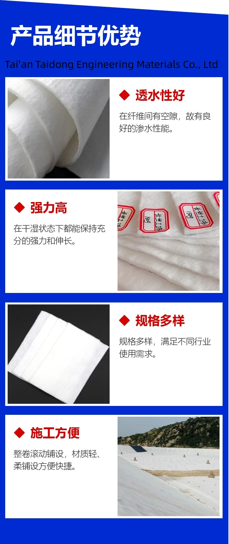斷裂強(qiáng)度及抗刺破強(qiáng)度等物理機(jī)械性能優(yōu)勢明顯,高于常規(guī)產(chǎn)品的2~3倍。相同克重的產(chǎn)品比重低;具有良好的耐酸堿性和好的熱熔粘合性,現(xiàn)場可加 工性良好,適應(yīng)各種工程條件的能力強(qiáng)。用于CRTSⅡ型板式無砟軌道系統(tǒng)的組成部分可減小軌道系統(tǒng)與橋梁面間的相互作用。